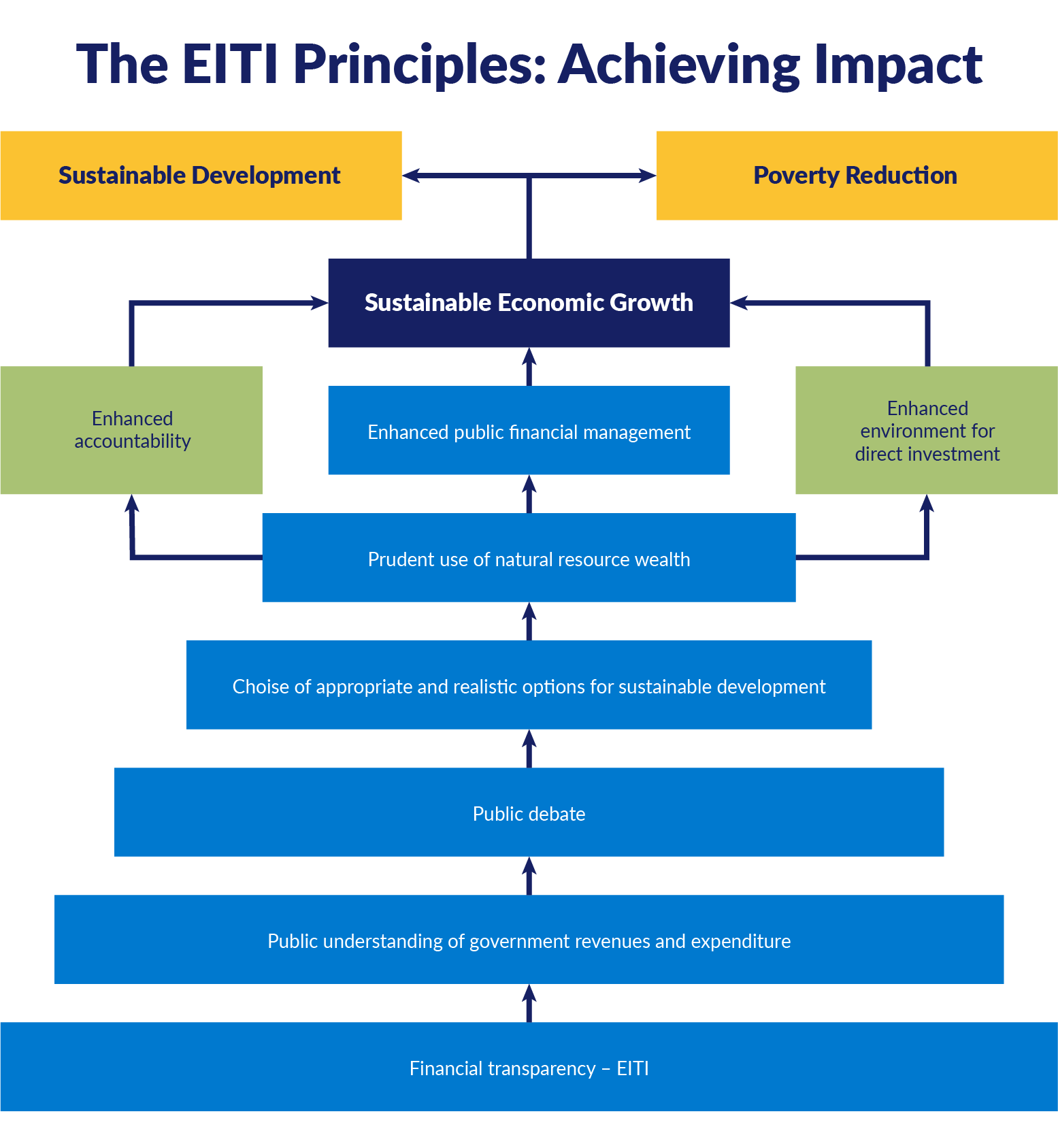 The causal path in the MDTF model suggests that by bringing about (financial) transparency and fostering public understanding and debate, the EITI would help inform better choices over resource-development linkages and enhance accountability, public (financial) management, and the Foreign Direct Investment (FDI) environment. This would lead to poverty alleviation and sustainable development. The MDTF stresses that this is not meant to be a one-size-fits-all model, but rather a tool designed to help countries situate the EITI indicators in relation to their specific national contexts.