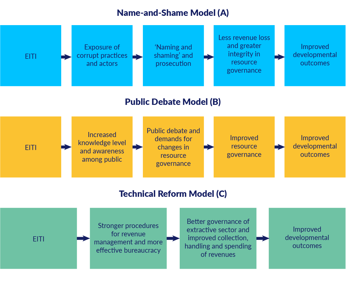 The models presented above all suggest different pathways towards the desired goals of the EITI, and that these pathways can be country and time specific. Hence, by considering only one of the models, we might grasp only parts of what the Theory of Change for EITI could be.