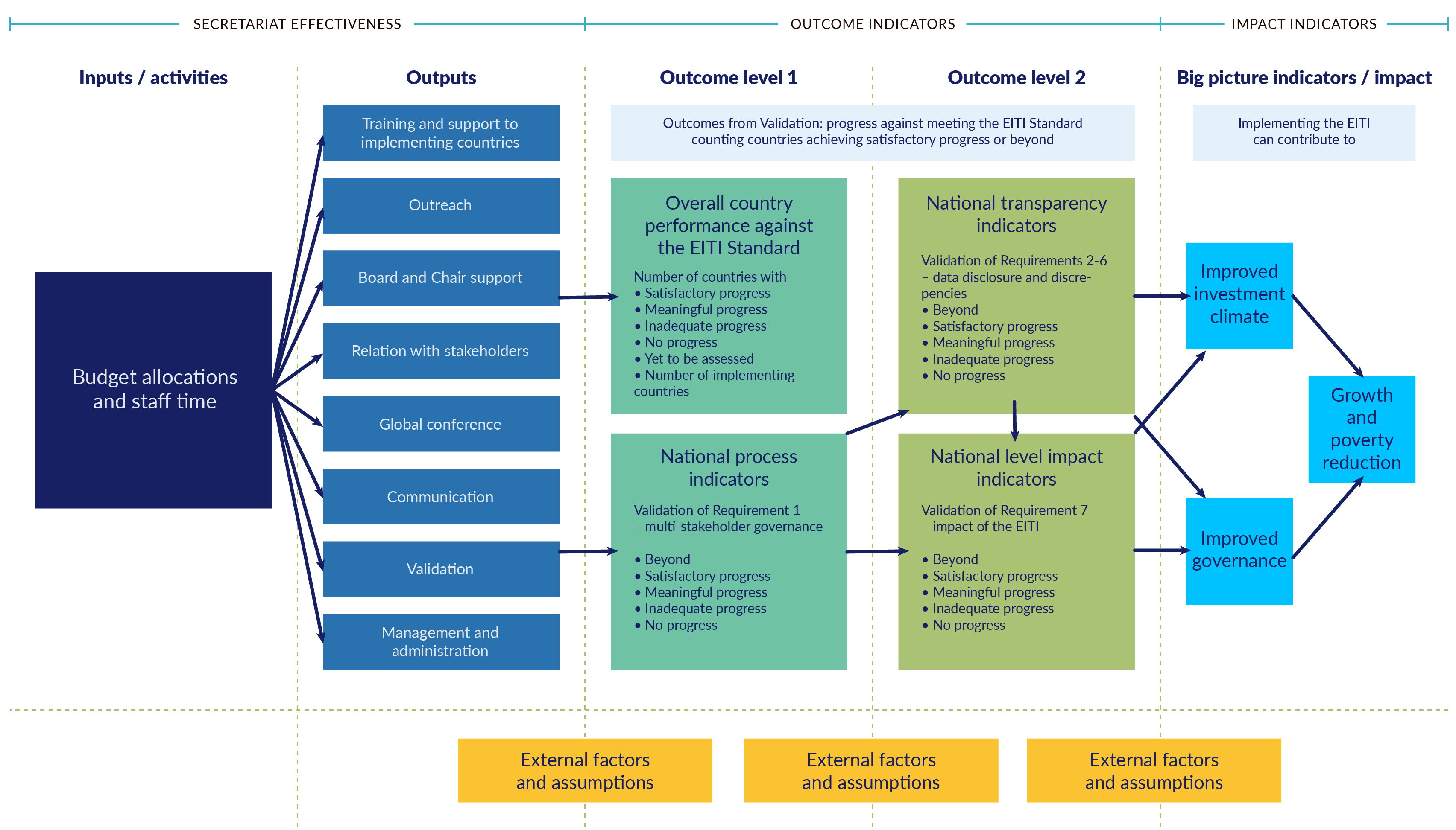 According to this ToC, if a country scores satisfactory progress on their indicators, this ‘can contribute’ to improved investment climate and governance, and ultimately to growth and reduced poverty. Notably, the ToC does not specifically address interlinks leading to change, and nor does it specify how transparency itself influences the changes. Nonetheless, the EITI’s key performance indicators are embedded in this ToC and are the basis for measuring the effectiveness by the EITI’s international management (ie the International Secretariat and the EITI Board).09c903f9464f
