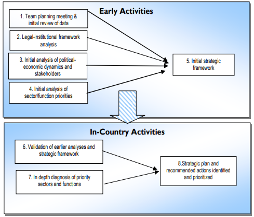 The risk assessment activities are divided into the early and in-country activities. The following figure showcases a flowchart of the anti-corruption assessment framework. For more details on the framework see: Anticorruption assessment handbook (2009) by US AID.
