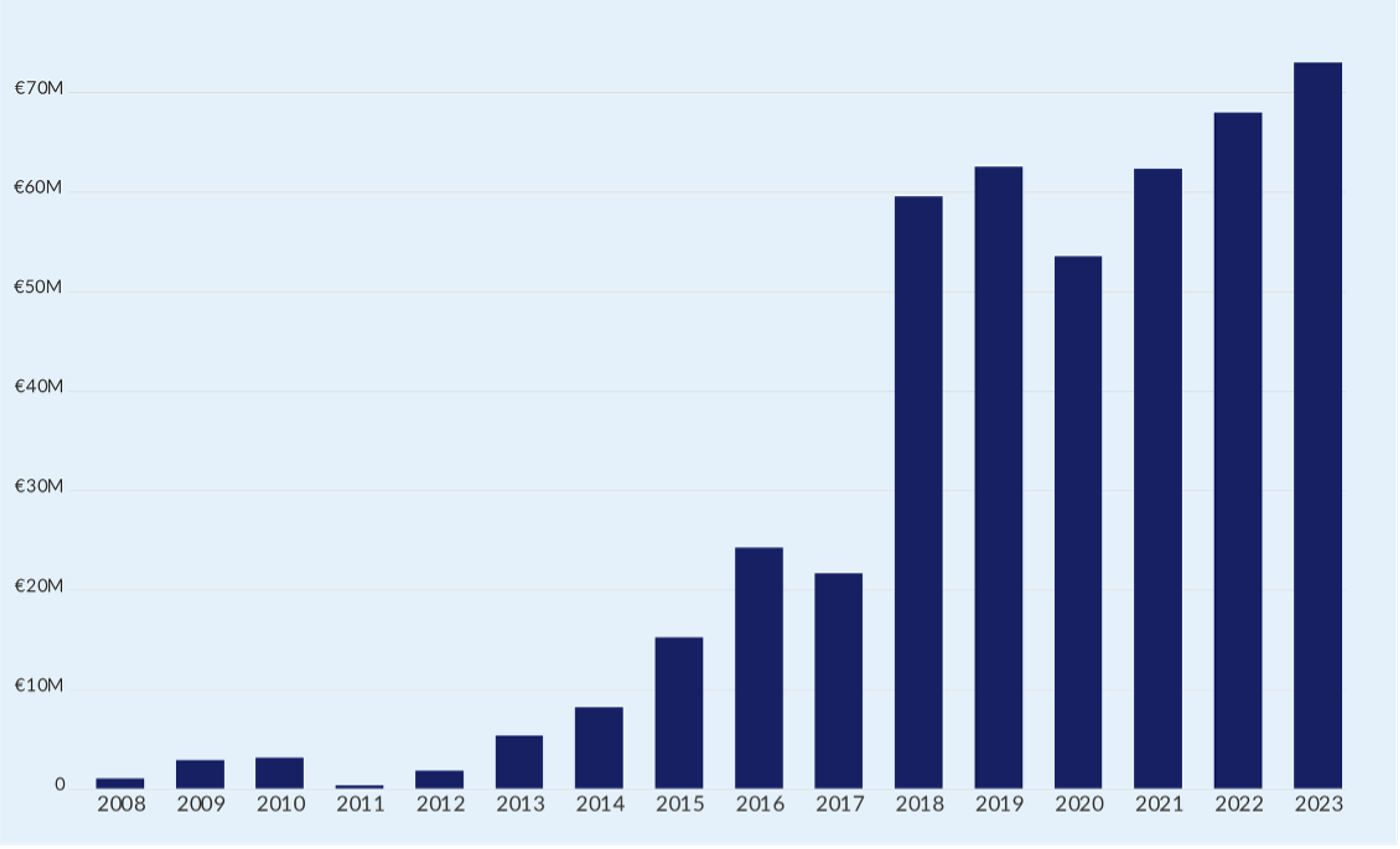 The analysis found comparatively low numbers of projects and activities by donors in this area – 430 million euros worth of activities commissioned on ACTA in health over a 21-year period between 2003 and 2024. However, this figure is likely to be an underestimate, as some donors’ data had missing elements that would have allowed a full analysis (see Figure 1).