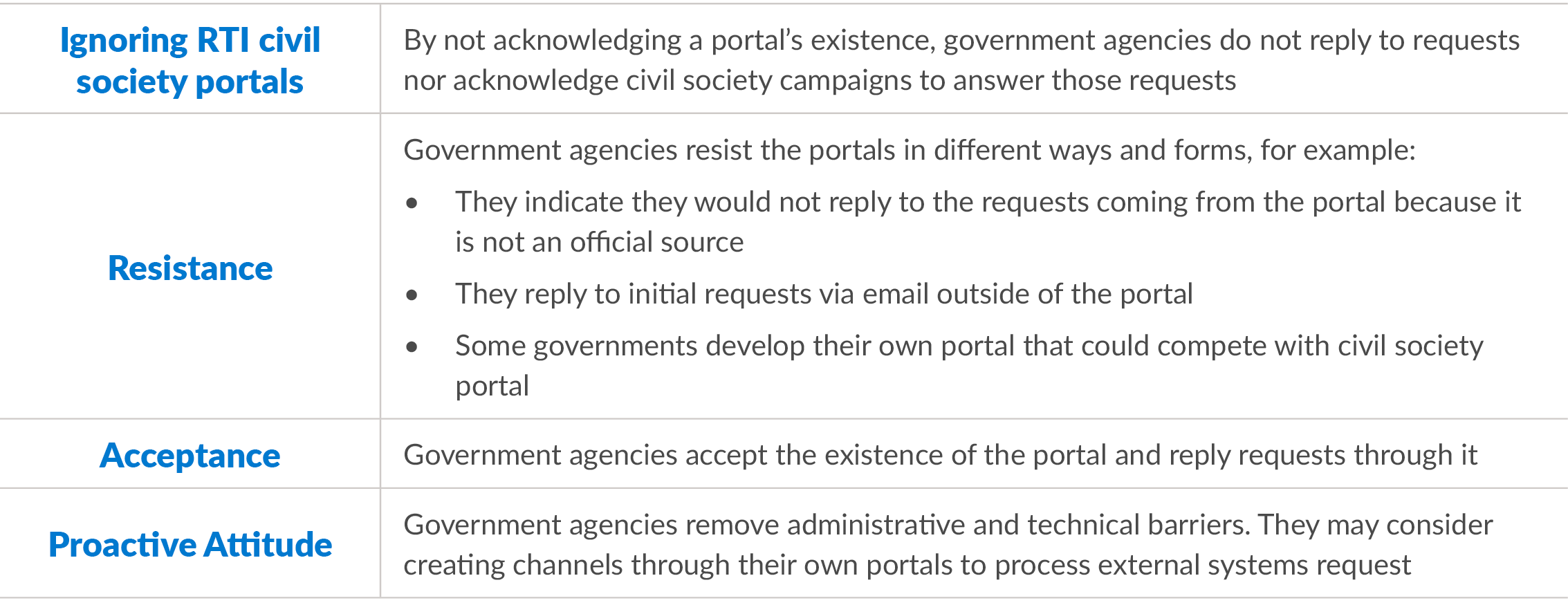 Governments are not monolithic entities and different agencies within a government might have different reactions to a RTI portal. As the implementation of the portal evolves, and the interaction between civil society actors and public officials increases, agencies might shift attitudes. Outlined in the table below are possible attitudes from agencies: