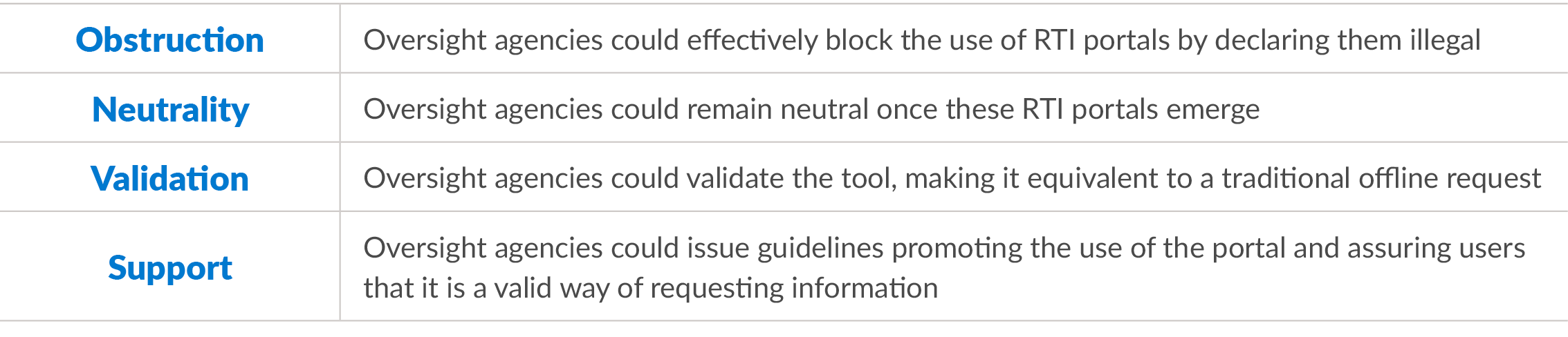 Another key actor in a RTI regime is the oversight agency that is responsible for the implementation of the legislation. Oversight institutions could react to the launch of civil society-led portals in different ways. There are four particular attitudes that these agencies could adopt, as follows: