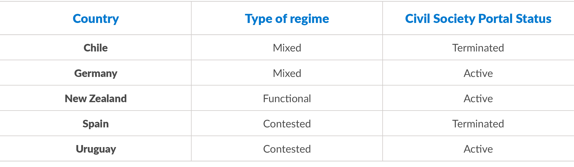 Chile, Germany, New Zealand, Spain and Uruguay were selected because in each case, civil society organisations developed and launched a RTI portal before governments created their own. These countries present differences in terms of oversight institutions, RTI legislation, and institutional traditions.These differences allow us to explore how these portals adapt to a diverse set of environments.