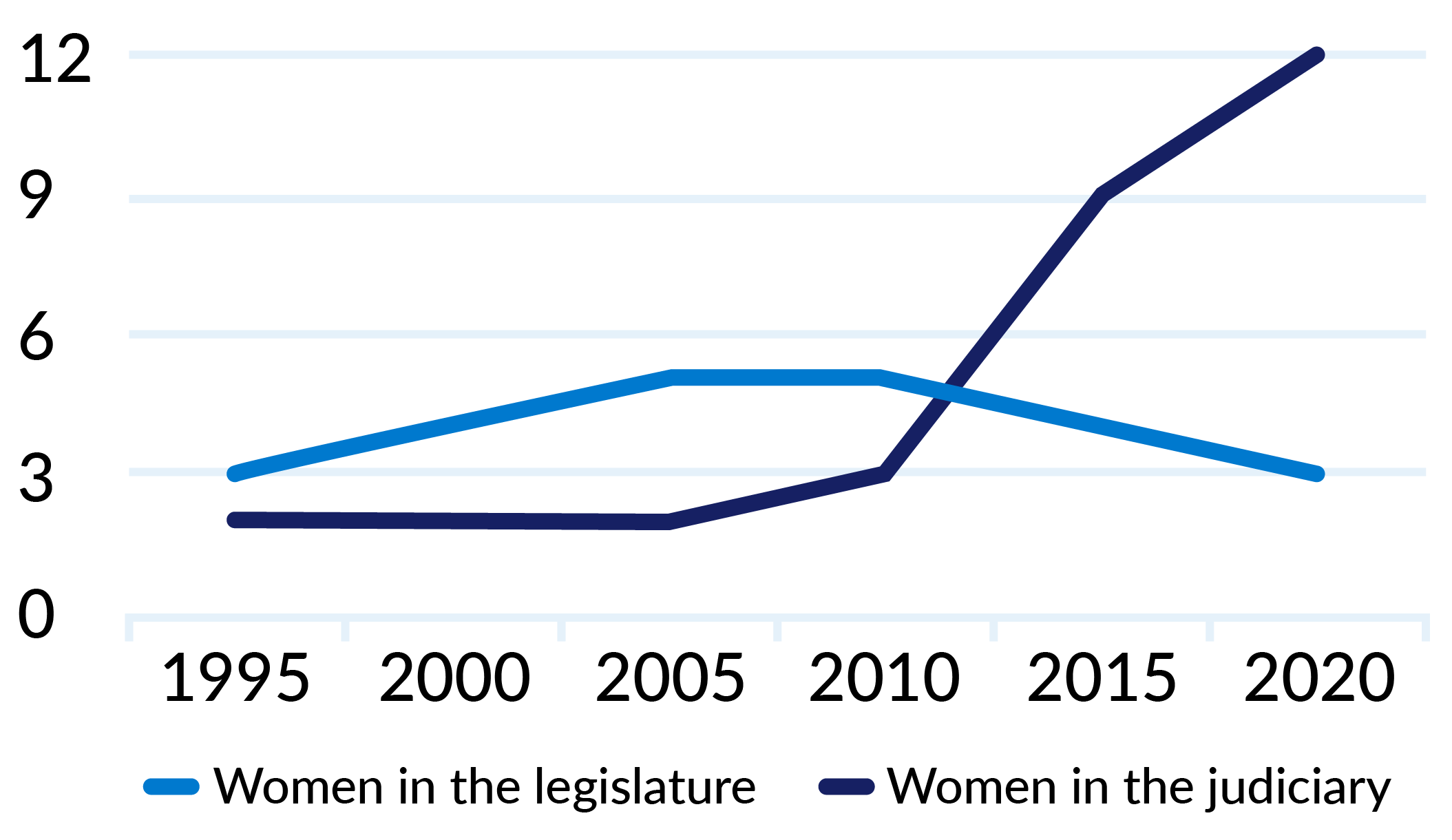 Complete and historic statistics on the evolution of women’s presence in the Haitian judiciary are hard to come by. The first woman magistrate, Ertha Pascal-Trouillot, entered the Court of First Instance in Port-au-Prince in 1979. In the mid-1990s, the proportion of women judges was reportedly 2%.89245538bb7c As shown in Figure 1, the past couple of decades have seen an increase in the proportion of women judges to 12% (101 women judges out of 867 judges in total), whereas women’s representation in the legislature has remained extremely low (just 3 out of 118 Members of Parliament, or 2.5%, in the last parliament were women).