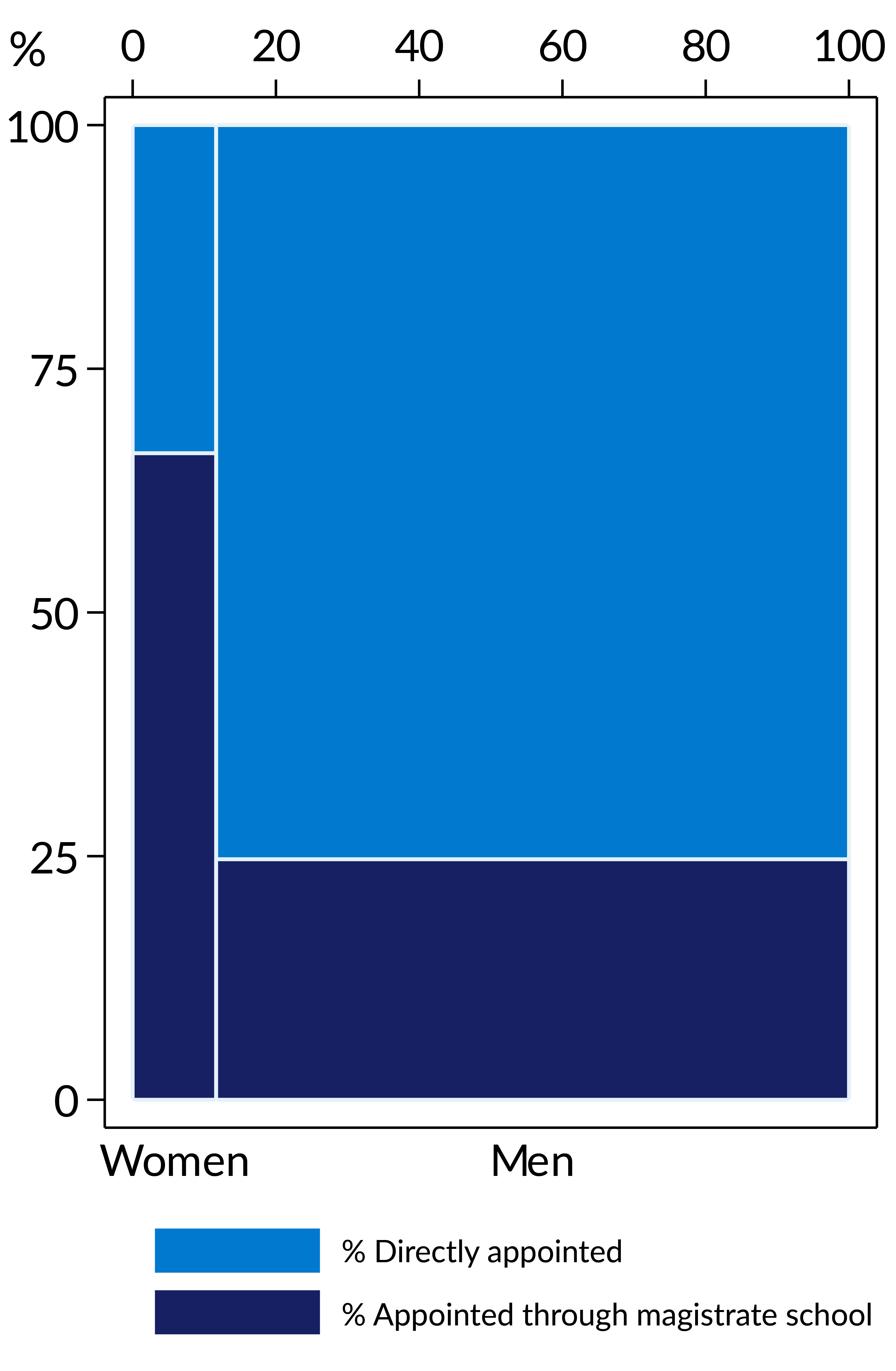 Figure 2: A higher percentage of female judges are appointed through the magistrates school compared to men.