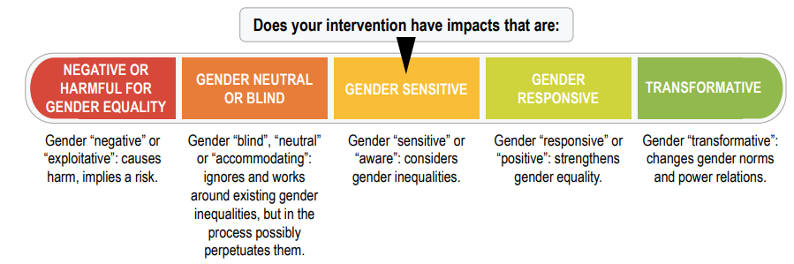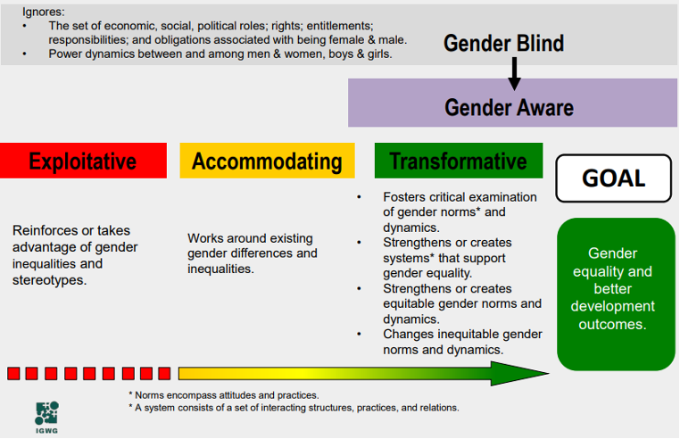 Since Gupta’s conceptual framework was put forward many development organisations have designed their own continuums based on her three concepts. These continuums illustrate the degree to which gender norms, relations and inequalities are analysed and explicitly addressed during a project design, implementation and monitoring (IGWG 2017:19). This aims to help move outcomes from development project outcomes from ‘do no harm’ to ‘do more good’ (MacArthur et al. 2022), moving down a continuum from gender blind to the goal of a gender transformative. As an example of ones of these, the Interagency Gender Working Group’s (IGWG 2017) illustration of the continuum is below: