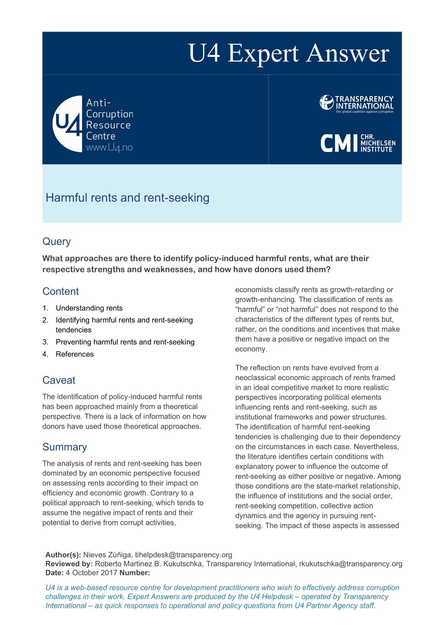 Zúñiga, N. 2017. Harmful rents and rent-seeking. Bergen: U4 Anti-Corruption Resource Centre, Chr. Michelsen Institute (U4 Helpdesk Answer 2017:12)