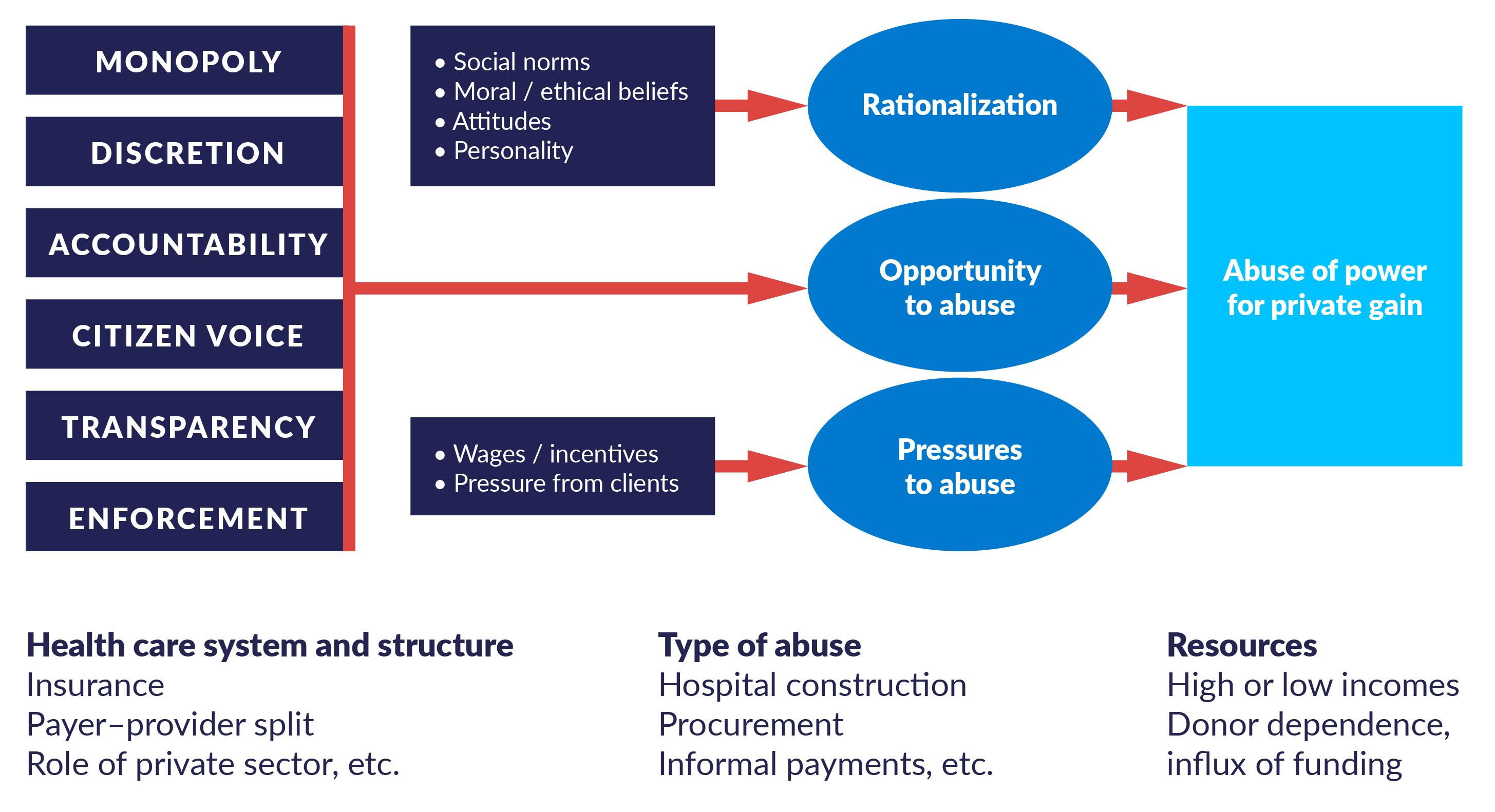 The various types of corruption find many manifestations in national health systems. Different health systems are prone to different types of corruption, and the risks for abuse depend in part on how funds are mobilised, managed, and paid.