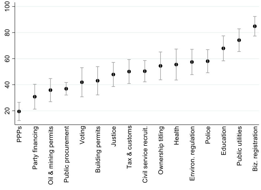 Note: The diagram reports the arithmetic means of the ratings given by the survey respondents. The error bars represent the 90% confidence interval for the means. The question is: ‘Imagine you have the power to observe all the individual interactions taking place between citizens/firms and public officials in each of the following 16 sectors. For each of them, please estimate the probability that a given interaction will involve the payment of a bribe.’ The average number of responses per sector is 22.8.