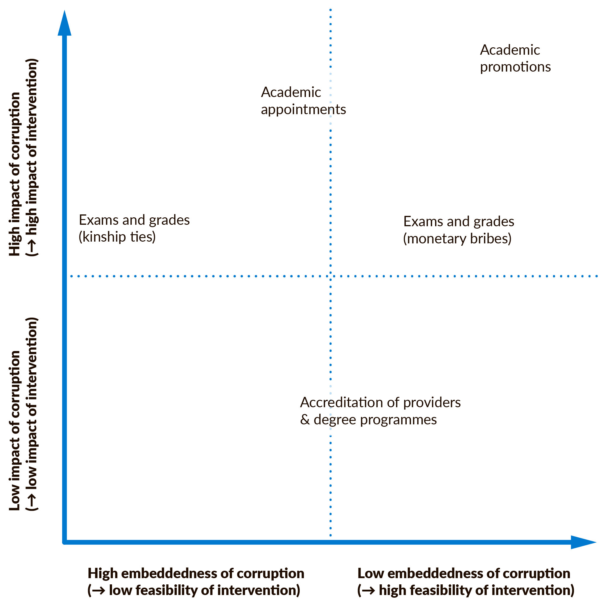 An illustrative action plan designed to fight education-specific corruption in Albania is presented in Table 3. In light of Figure 12, this action plan targets two corrupt practices that are likely to be relatively responsive to external interventions, while also having a high negative impact on the education sector: (1) monetary corruption in the award of exam grades, and (2) unmeritocratic academic promotions. In addition, the plan seeks to mobilise two sets of actors that have both an interest in change and the power and influence to potentially push for change – namely, professors and the student movement.