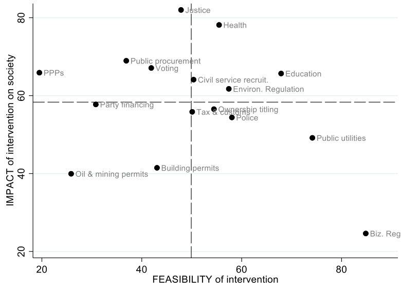 To systematise and extend the political economy analysis, donors should rank corruption sectors in terms of how amenable they are to external interventions – that is, how feasible interventions are likely to be in each sector, given the prevailing distribution and forms of political power in the target country. One way to do this is to run a poll of experts. Towards this end, our survey asked respondents to rate ‘the probability that powerful individuals/organisations may successfully resist or distort an (otherwise well-designed and adequately resourced) anti-corruption intervention to the point that the intervention may fail to substantially reduce corruption.’ A low probability of failure suggests that the intervention is feasible. The feasibility ratings are presented in Figure 7, where the vertical axis shows the estimated probability of success of an anti-corruption intervention.cd52d9ad59ab Among the sectors that are believed to be most amenable to anti-corruption interventions are education, public utilities, and health and environmental regulation. Public procurement and PPPs, by contrast, are among the sectors where anti-corruption interventions are most likely to face resistance by powerful groups.