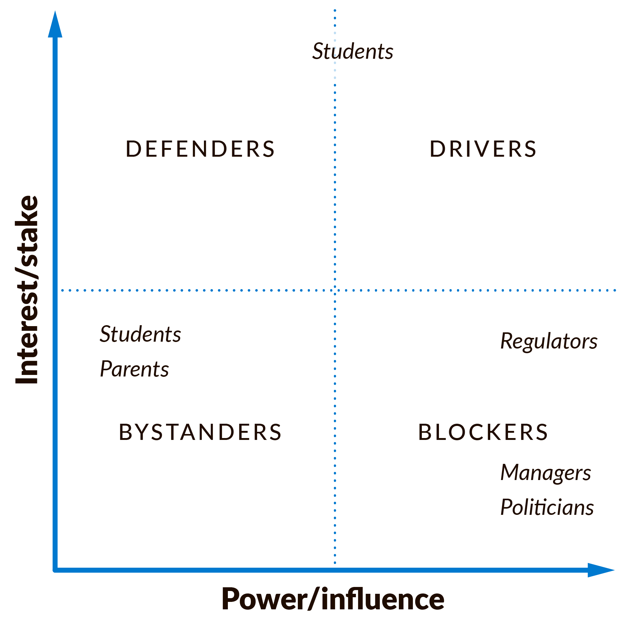 Ministry of Education, private university managers, donors Organised student bodies, donors |