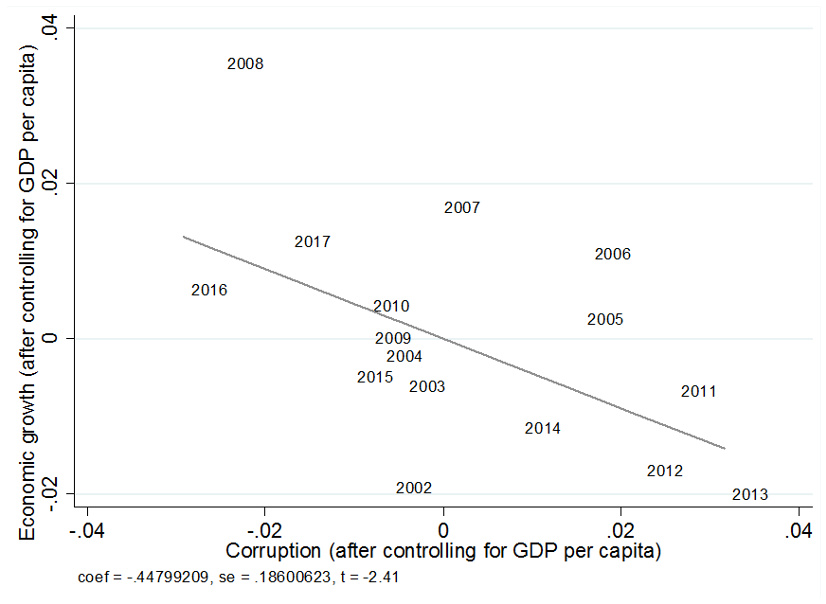 Figure 1: Corruption and economic development in Albania, 2002–2017