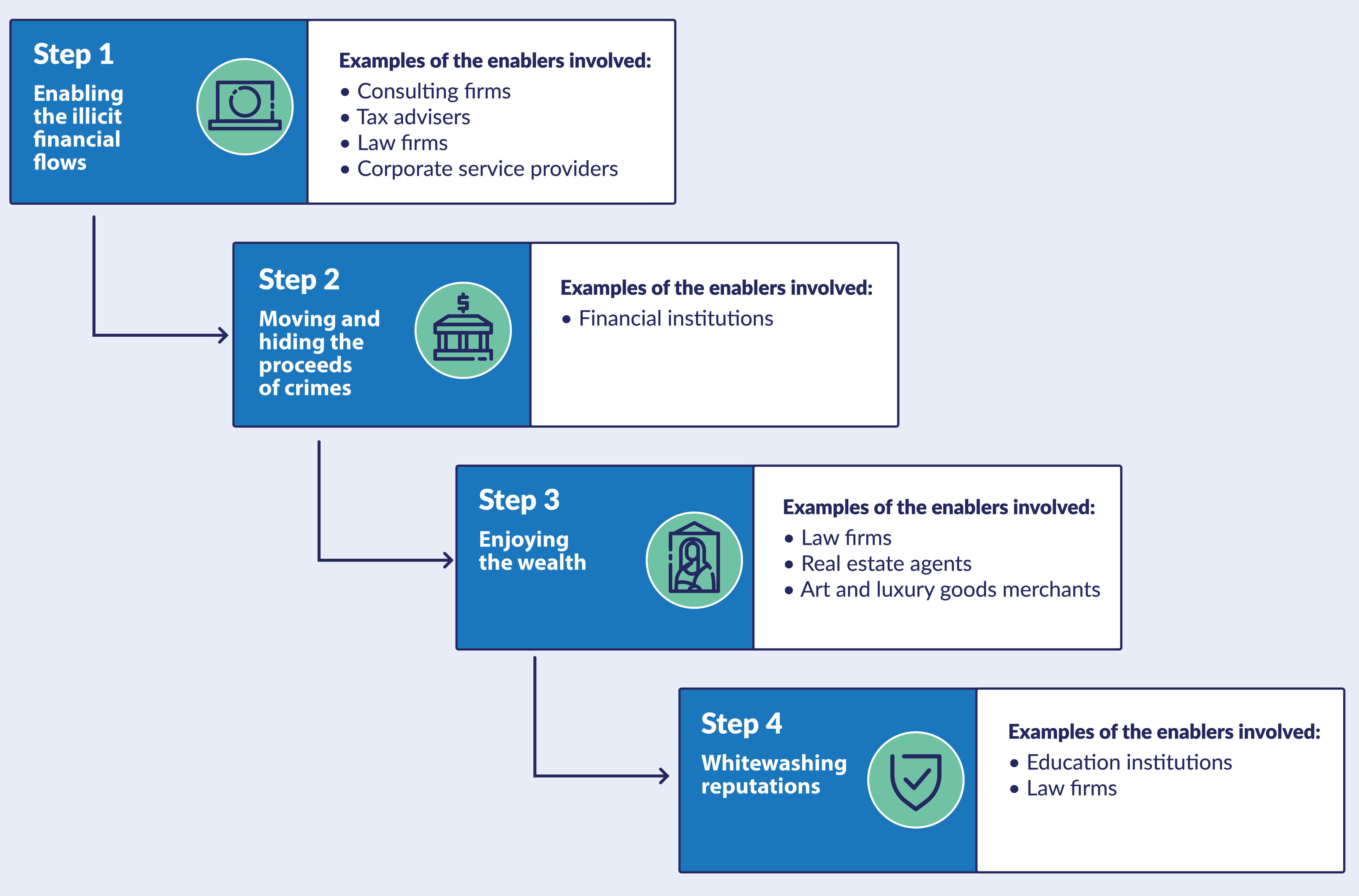 Proceeds of corruption and other forms of IFFs, including money laundering and tax evasion, regularly end up in countries other than the country where the IFFs took place. To move this money out of their own country, kleptocrats need experts and advisers: the enablers that set corruption and tax evasion schemes in motion and that have specific knowledge, training, skills and experience. Different enablers intervene at various stages, providing diverse services. Enablers provide services to kleptocrats to: