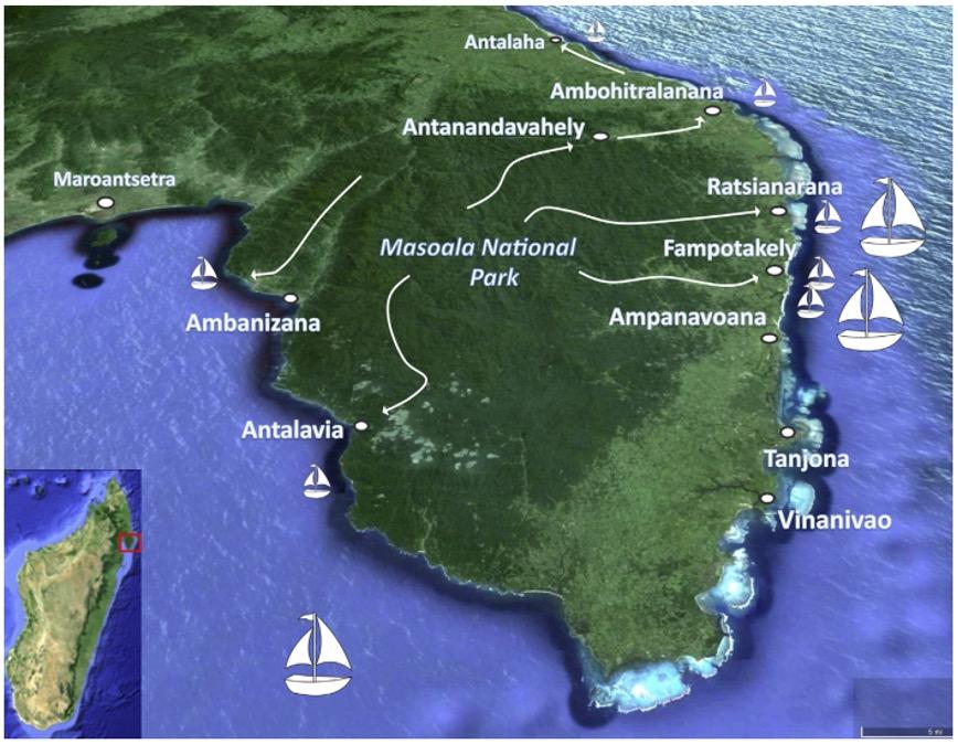 Figure 2: Map of the flow of logs from Masoala National Park. Rosewood logs travel from the park’s interior to the villages and coastal boats for overseas shipment (Anonymous 2017).