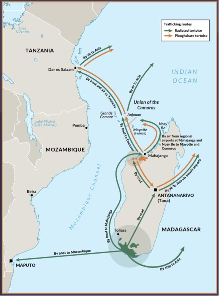 Figure 3: Major trafficking routes of ploughshare and radiated tortoises, within Madagascar and across the region (Nelson and Cochrane 2020).