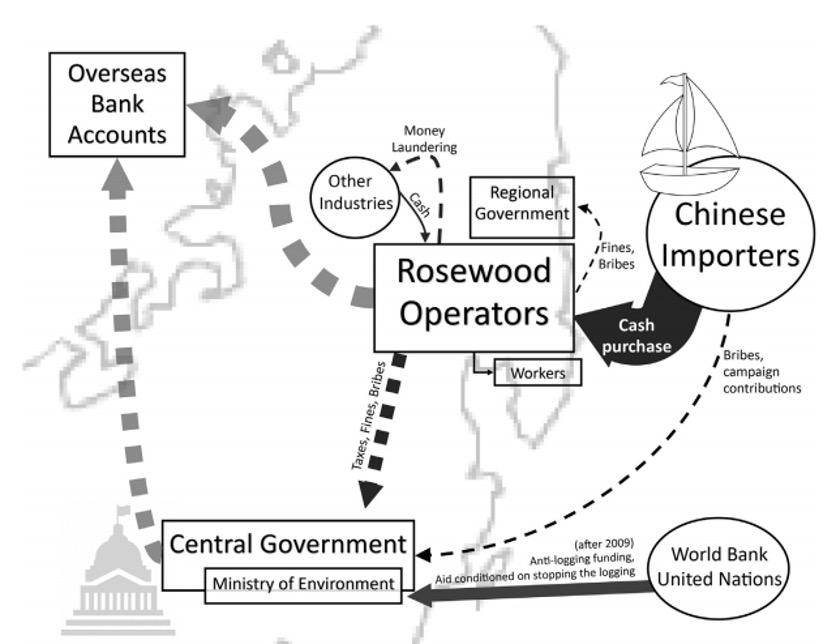 Figure 1: Map of financial flows and key players in the rosewood trade. Arrows approximate relative size and direction of financial flow. Dotted lines represent transactions of questionable legal status. Circles represent sources and squares represent sinks (Anonymous 2017).