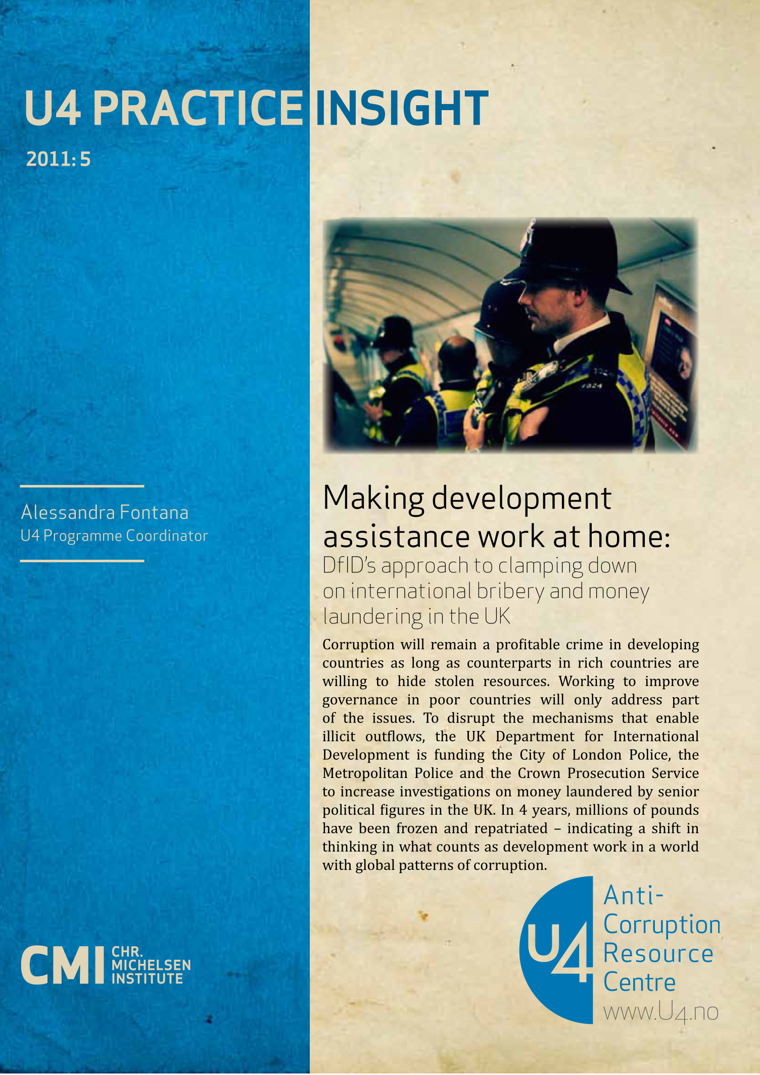 Fontana, A. 2011. Making development assistance work at home: DFID's approach to clamping down on international bribery and money laundering in the UK. Bergen: Chr. Michelsen Institute (U4 Practice Insight no. 2011:5) 12 p.