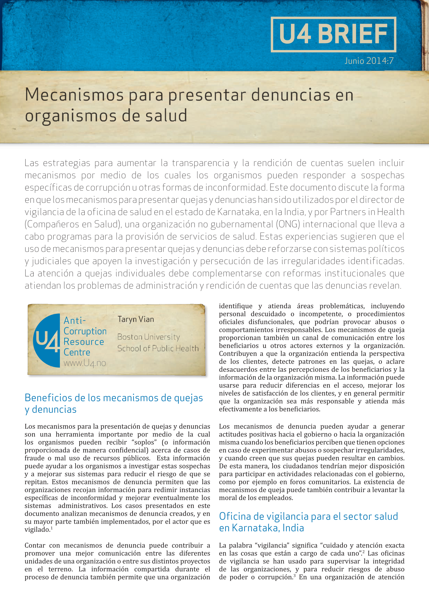 Vian, T. 2014. Mecanismos para presentar denuncias en organismos de salud. Bergen: Chr. Michelsen Institute (U4 Brief 2014:7) 5 p.