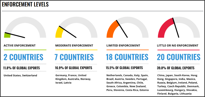 This spread of regulation has not always been backed by corresponding levels of enforcement. In 2022, Transparency International (2022: 10) assessed that only two of the 47 countries surveyed were actively enforcing the OECD Convention (Dell and McDevitt 2022: 10) due to shortcomings in the fulfilment of many provisions (see Figure 3). Furthermore, a 2019 review by the OECD (2019: 13) found that only 23 of the 44 parties to the convention had successfully concluded a foreign bribery action.