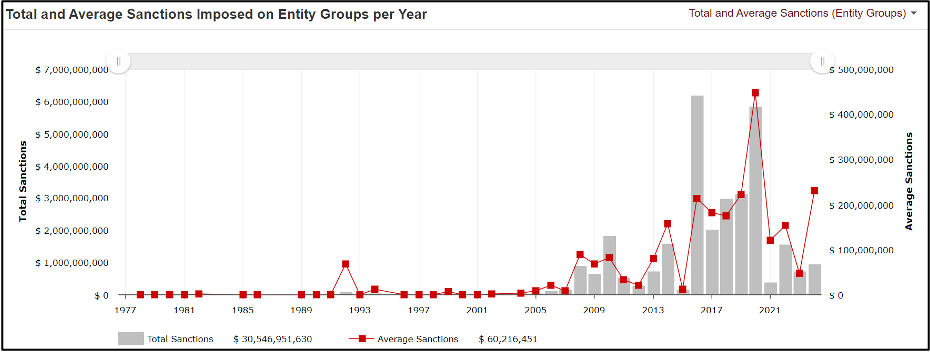 Figure 1: Total and average sanctions imposed on entity groups under FCPA proceedings (1977-2024)