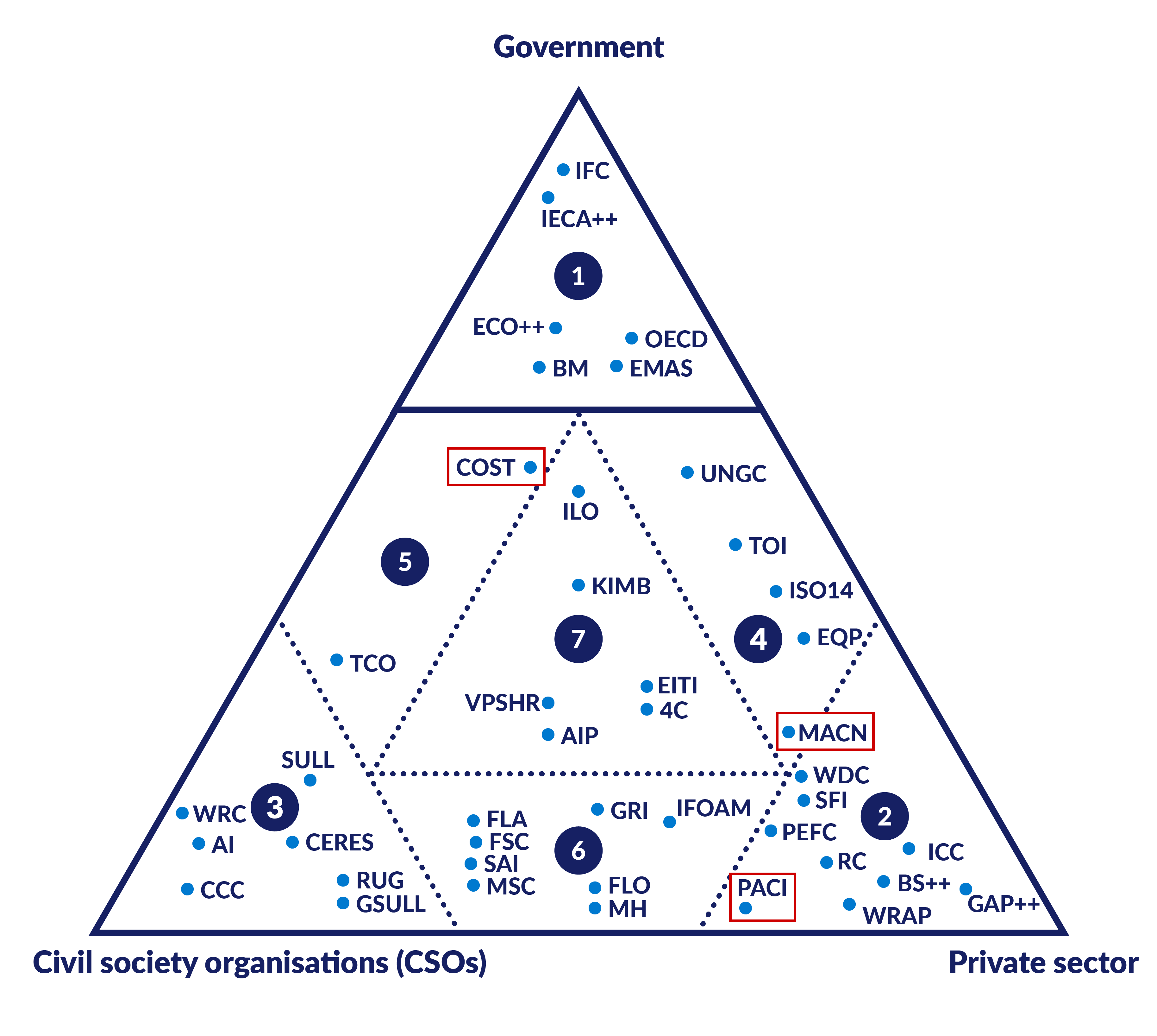 We used Abbott and Snidal’s58c8359c0de6 ‘Governance Triangle’ to help visualise MSPs’ governance structures and make a case selection. The seven zones of the triangle represent different possible combinations of stakeholder participation, between government, the private sector, and civil society organisations (CSOs).0ef91a2495d4 Following Abbott and Snidal’s definition, the governance shares depend in part on formal rules and tacit operating norms. For example, if a private company engages CSOs to monitor compliance, the arrangement would be placed between the private sector and CSO vertices.