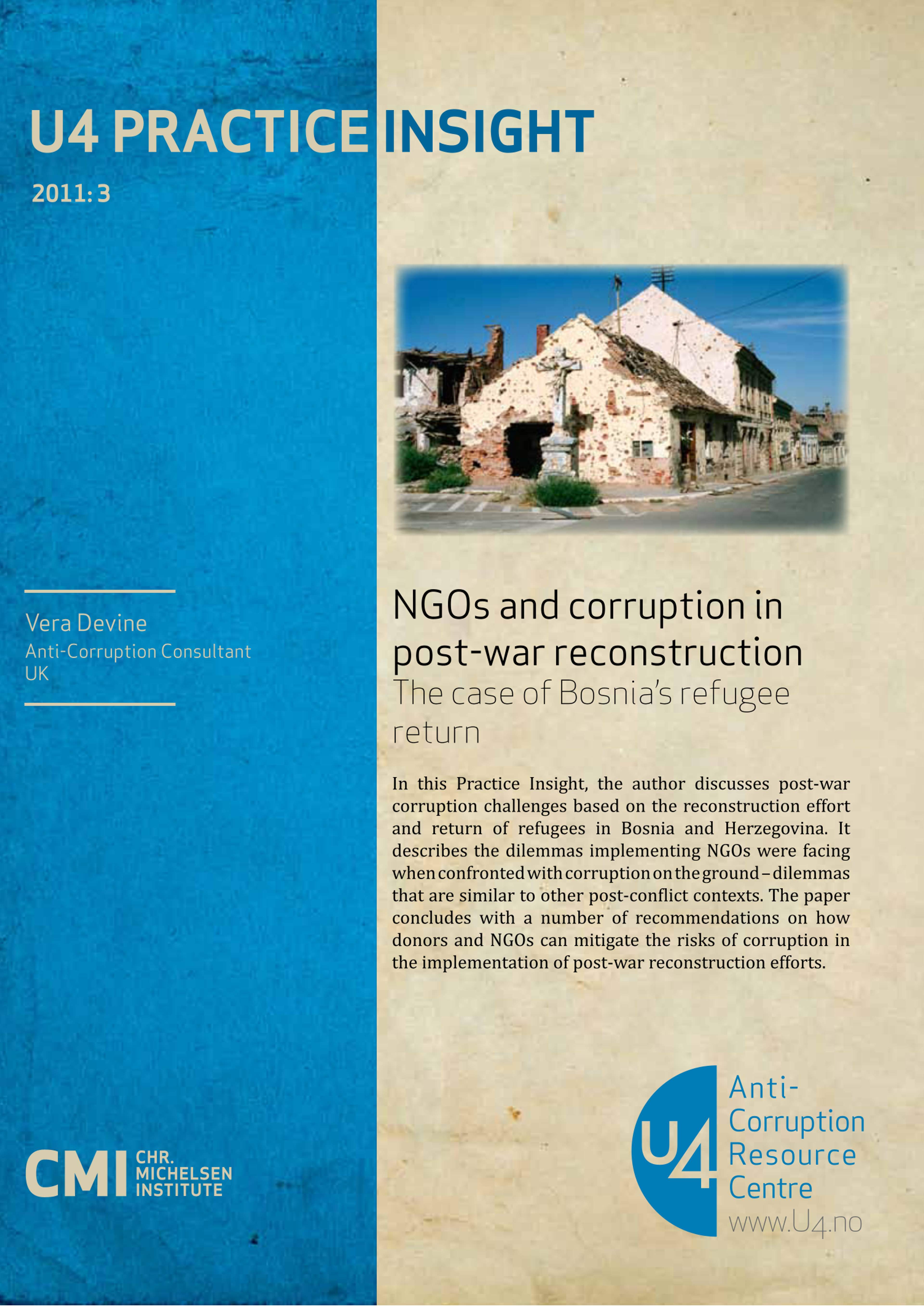 Devine, V. 2011. NGOs and corruption in post-war reconstruction: The case of Bosnia's refugee return. Bergen: Chr. Michelsen Institute (U4 Practice Insight no. 2011: 3) 7 p.