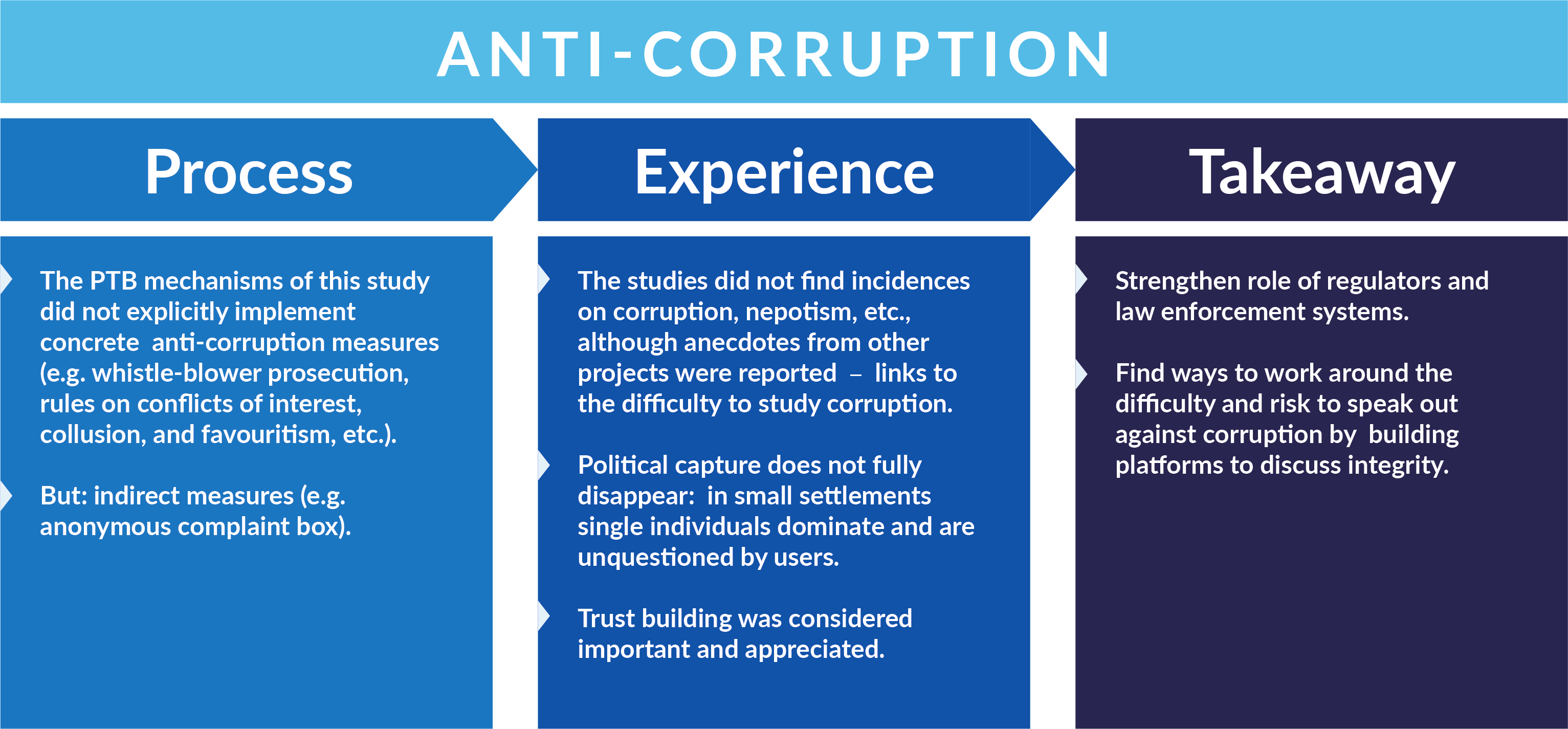 The PTB measures in this study did not explicitly implement concrete anti-corruption measures, such as whistle-blower protection or rules against conflicts of interest, collusion, and favouritism, etc. However, some projects implemented indirect measures, such as an anonymous complaint and feedback boxes, which many participants used and very much appreciated. While the users did not report incidences of corruption, the studies showed that political capture remains a problem in these processes: in small communities, single individuals often dominate the discussions and cannot be questioned or challenged. This is why it is significant that the users saw trust-building as a valuable outcome of the measures.
