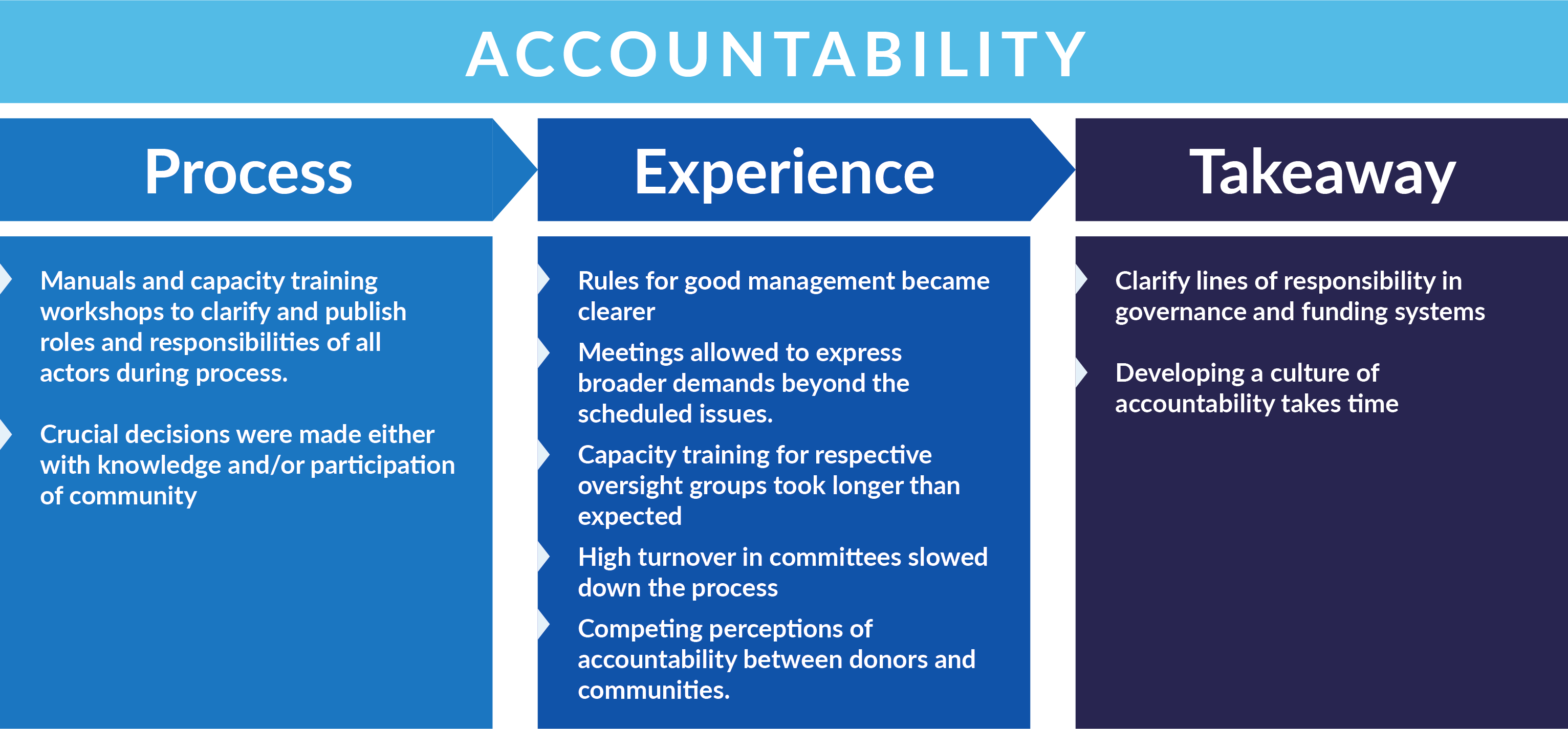 However, there were also challenges: capacity training for oversight groups took longer than expected, and, in one case, high turnover in the committee slowed down the overall process. It is therefore crucial that lines of accountability are clear and institutionalised and that they align with the expectations and culture of the community. This requires some negotiation and takes time.
