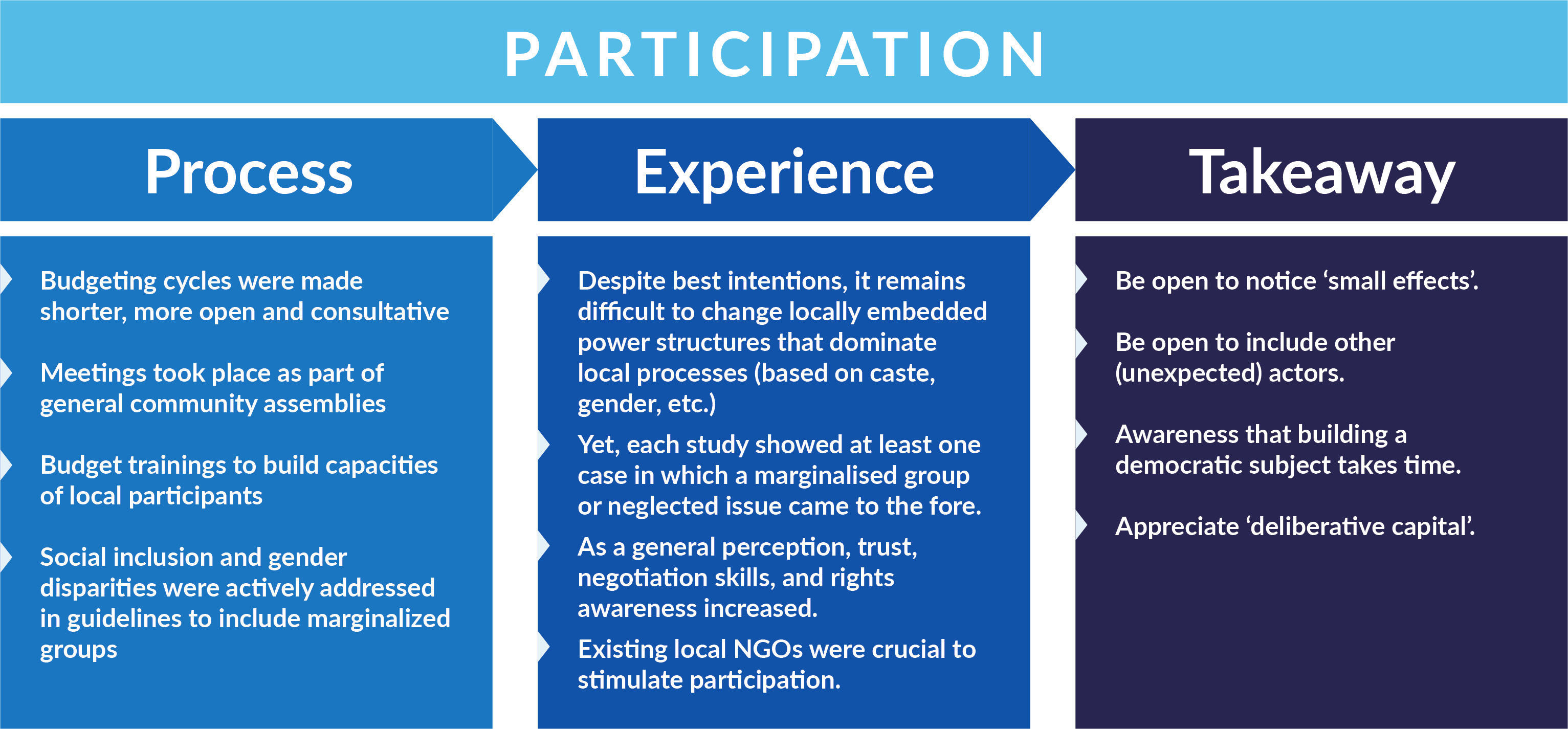 The cases indicate that PTB measures open up new spaces for deliberation and create opportunities for citizen collaboration, raising awareness of rights, and supporting citizens’ will to hold service providers to account. In so doing, PTB measures fill the gap created by weak institutions or, in more authoritarian settings, they may carve out a space for greater citizen participation in governance. As a result, donors should recognise and appreciate the development of deliberative capacities and trust building as a major goal in itself and as an important precondition to strengthen the links between TAPA. Building such a culture of accountability takes time and is not always a linear process.