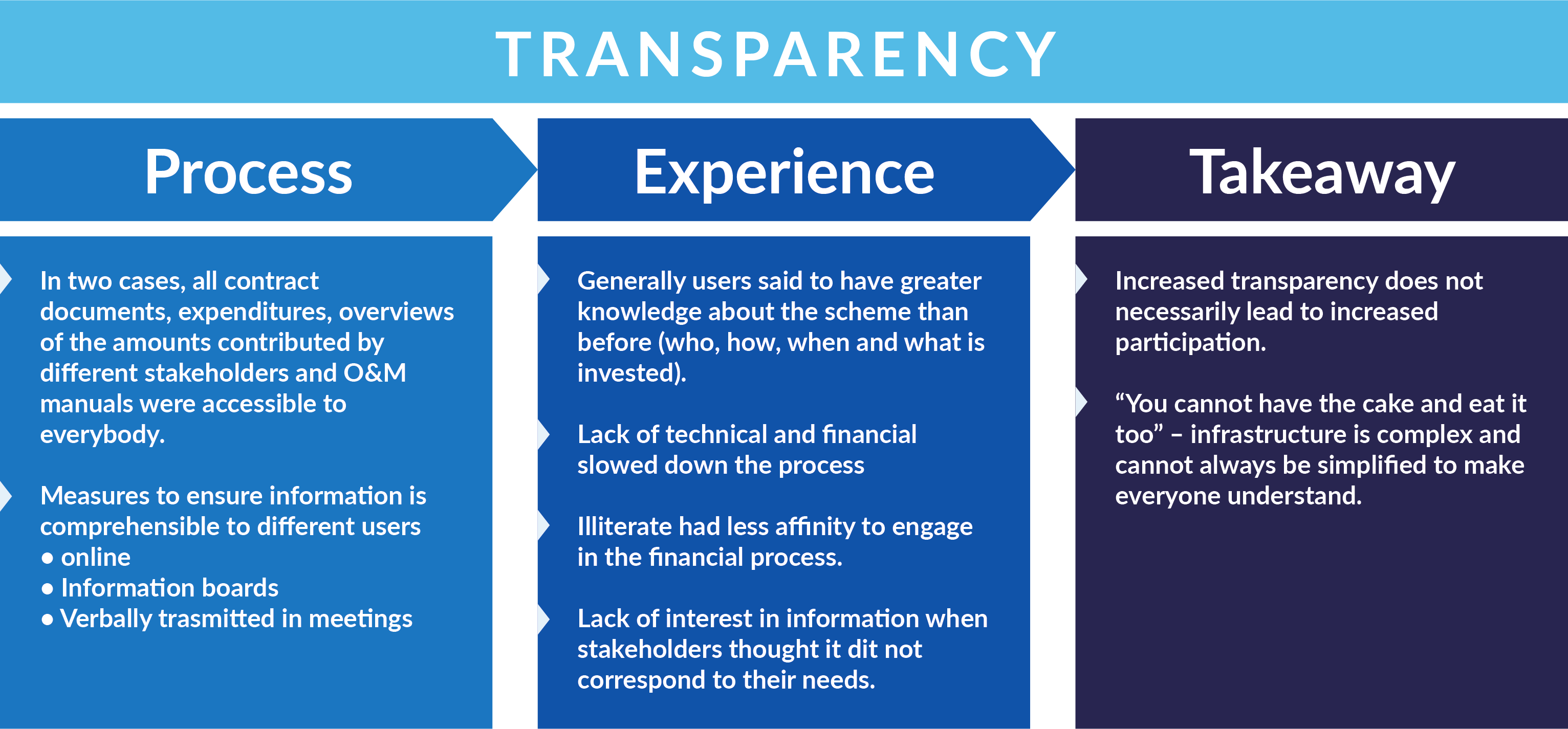 ‘Transparency’ refers to an open flow of information and is necessary for water integrity. As it applies to participatory and transparent budgeting, transparent practice presumes that all accounts, intentions, project members, and steps of the budget cycle are openly published, accessible, timely, and reliable. In both case studies, all contract documents, expenditures, overviews of the amounts that different stakeholders contribute, and O&M manuals were accessible to everyone. Each programme took specific measures to ensure that this information was not only available, but also comprehensible to the different users. Generally, users ended up with greater knowledge about the scheme than they had had before. However, there were also some challenges: despite capacity training, a lack of technical knowledge made it difficult to meet some demands articulated at the public meetings. Moreover, illiterate stakeholders had less interest in engaging in the financial processes, and stakeholders (literate and literate) engaged less when they thought that the scheme did not correspond to their needs. Participation thus depends in part on comprehension of the published information: if local users do not understand the information or do not find the scheme relevant for their needs, they are less likely to engage with it.