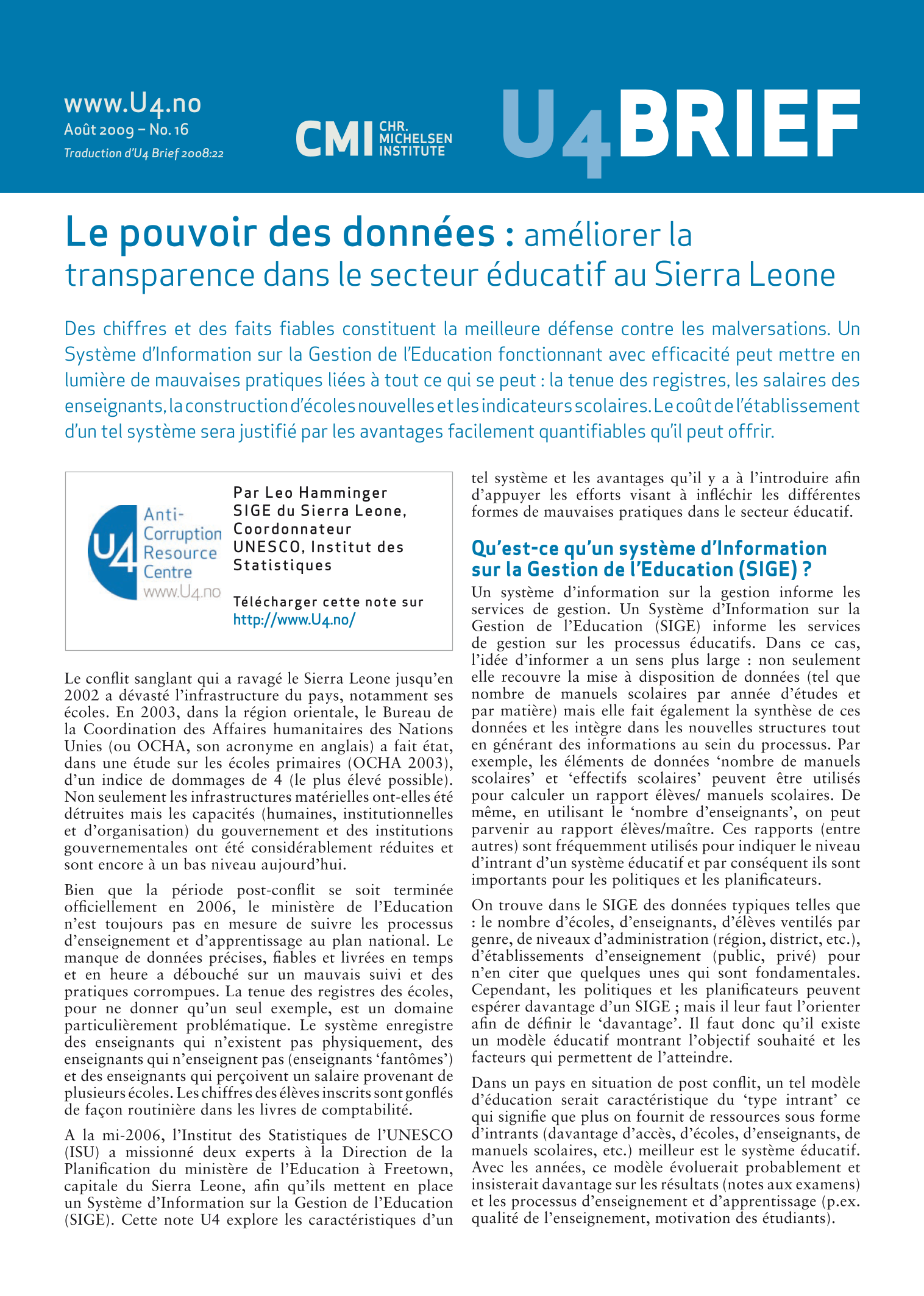 Hamminger, L. 2009. Le pouvoir des données : améliorer la transparence dans le secteur éducatif au Sierra Leone. Bergen: Chr. Michelsen Institute (U4 Brief 2009:16) 4 p.