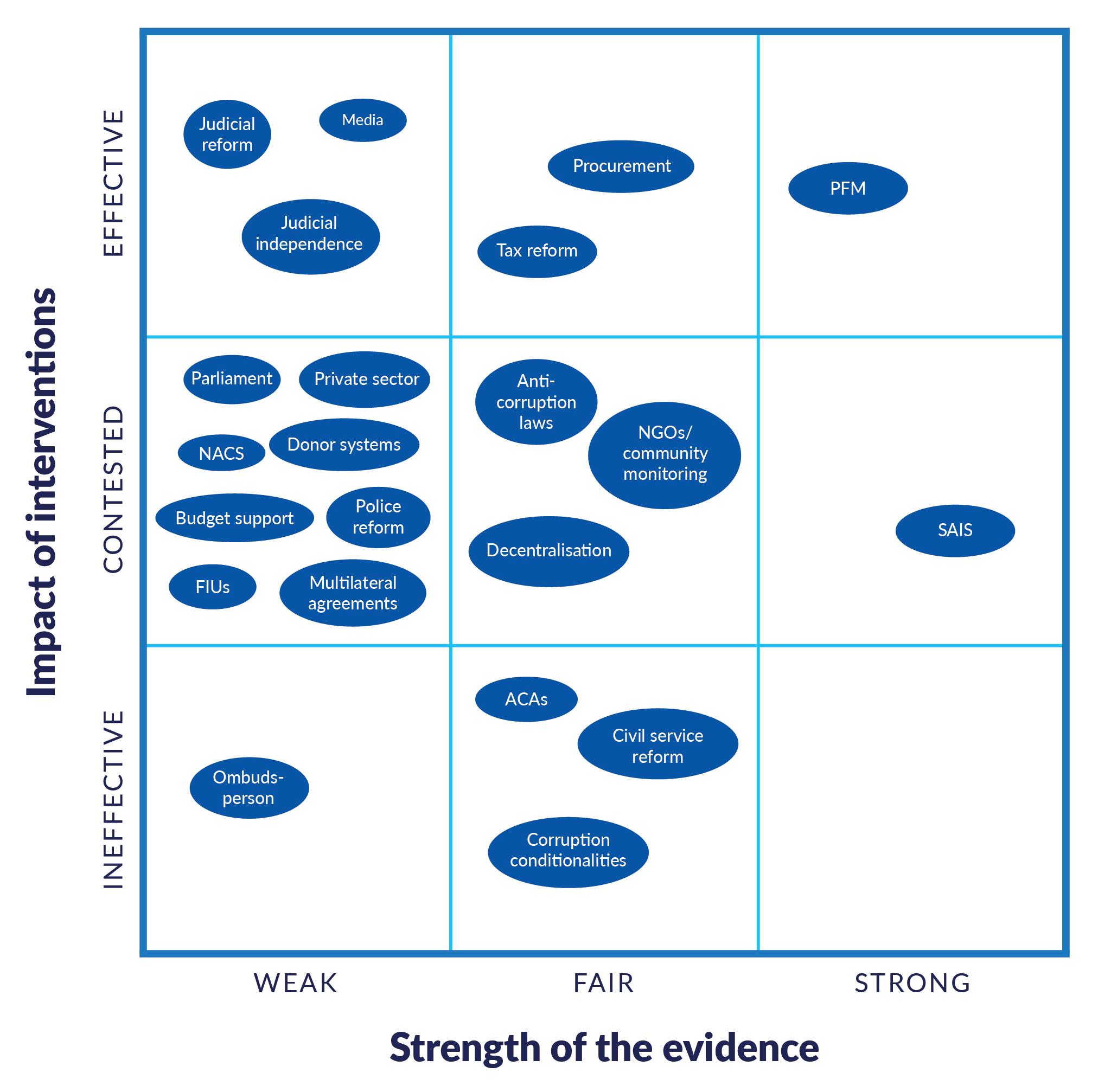 - Only one area – public financial management (PFM) – appears to be both successful and have a strong evidence base to prove it. But this is thought to be more due to there simply being a larger body of studies on PFM, compared to other interventions, on which to draw.