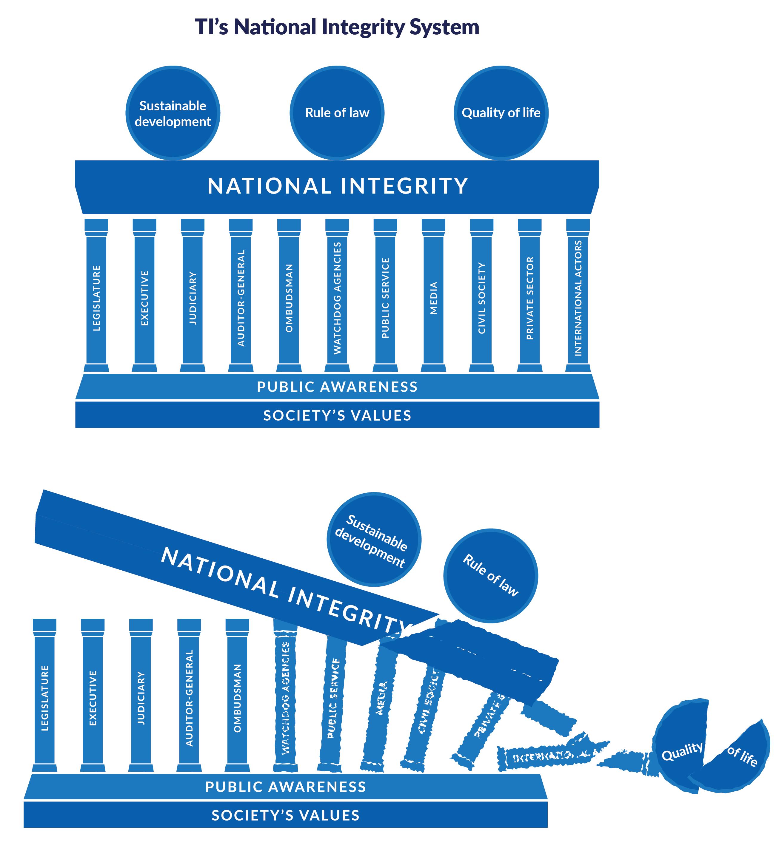 Appreciating the connectivities needed for bearing down on corruption at a society level is crucial. It has been famously illustrated by Transparency International’s temple diagram, showing how vital each pillar is to the whole edifice … and the consequences for ignoring the relationship.